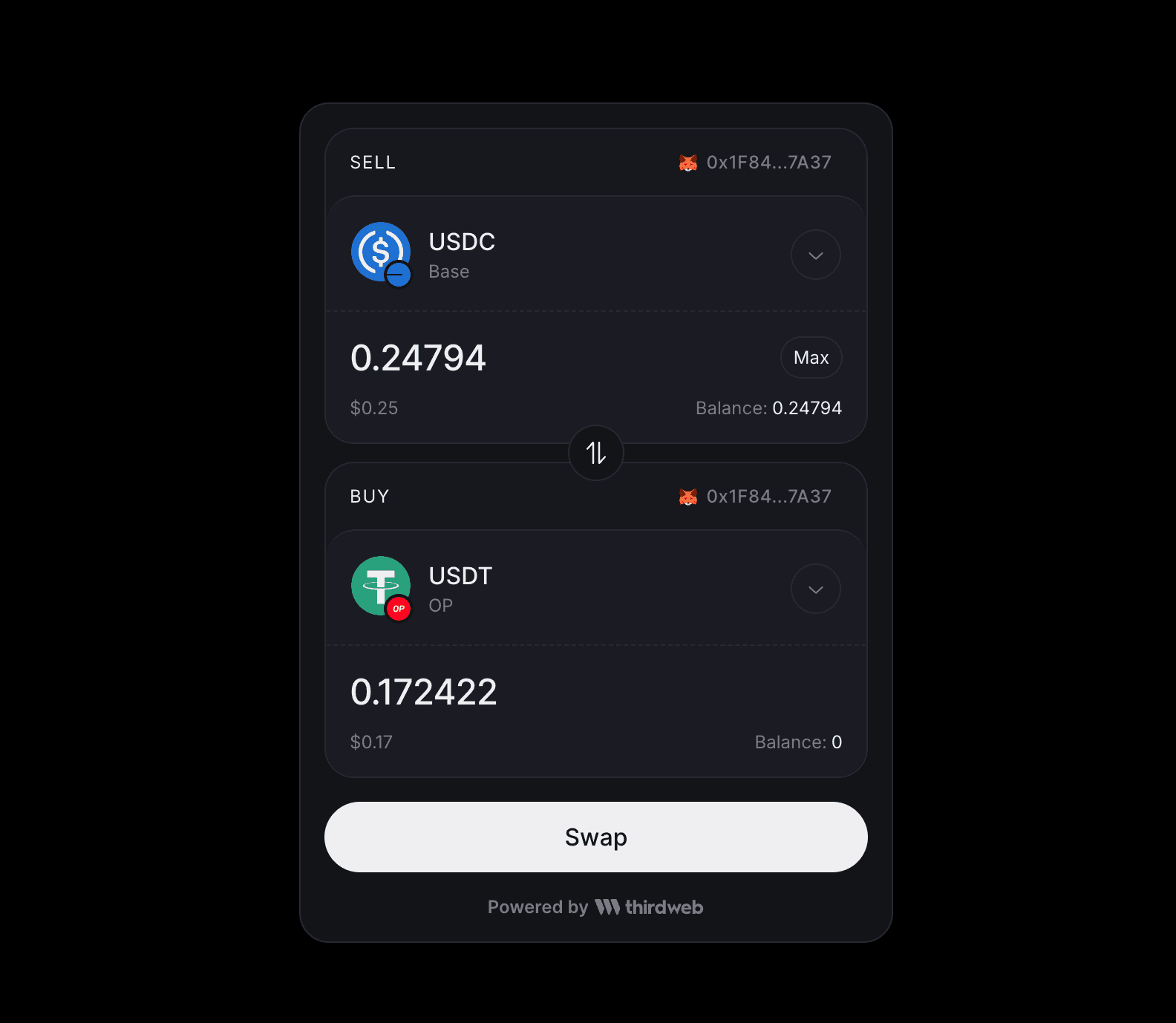 You can use the SwapWidget component to easily integrate a token swap interface into your app