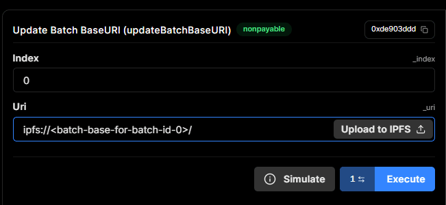 Now you have both the batch ID (zero) and the new batch base URI, you can go back to the Dashboard Explorer, enter the two parameters, and hit Execute. That new names for the NFTs should be reflected in a short while.