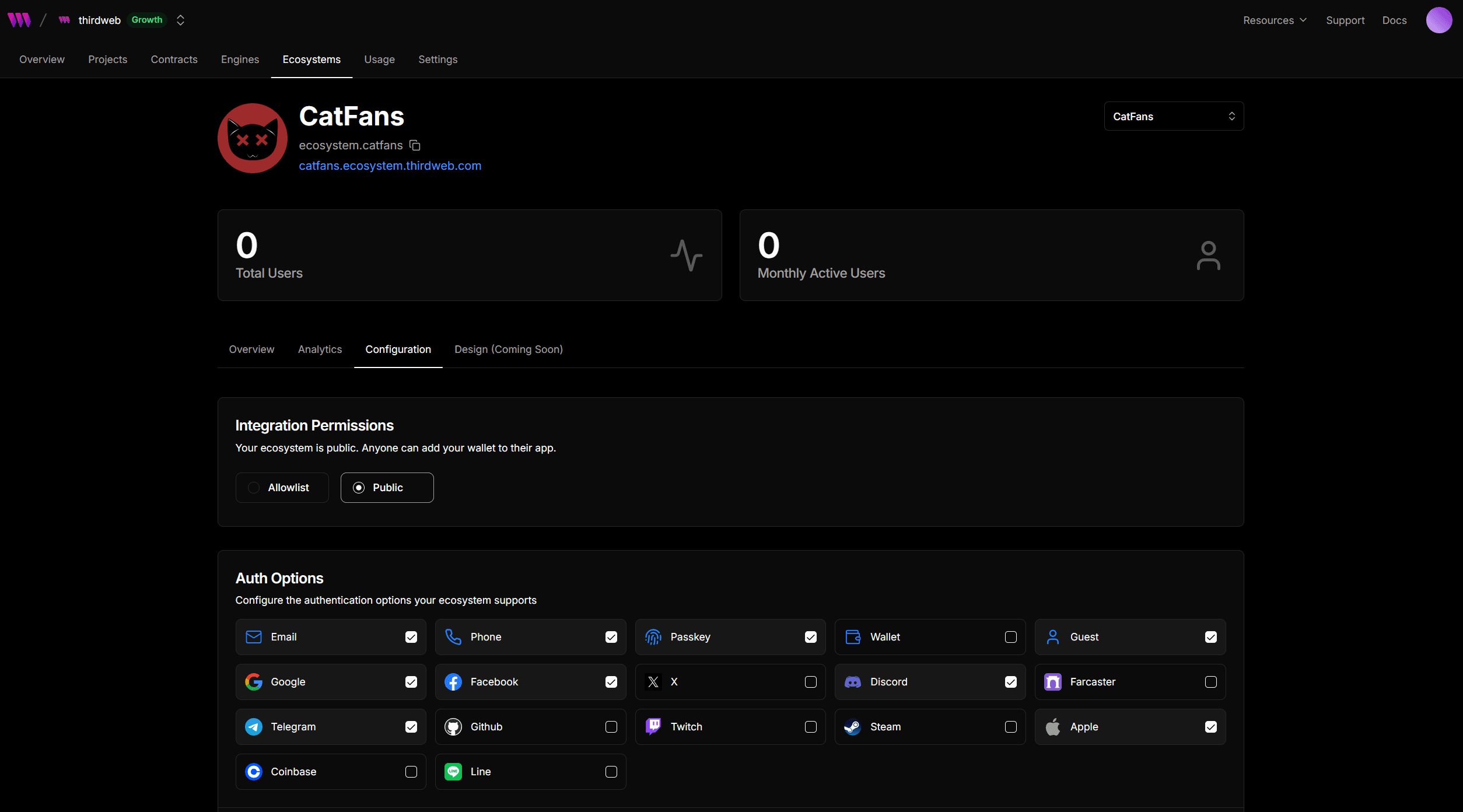 Head over to the thirdweb dashboard to create an ecosystem and obtain your ecosystem id.