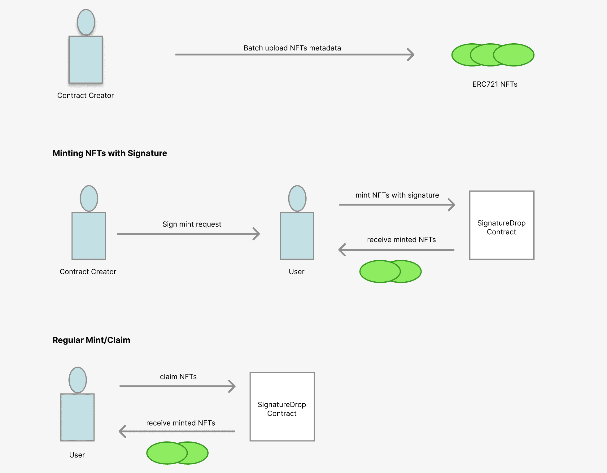 Any external party can present a smart contract implementing the 'signature minting' mechanism with a payload, along with the signature generated from a contract admin signing the payload. Tokens will then be minted according to the information specified in the payload.